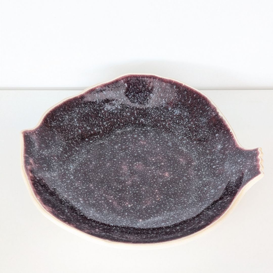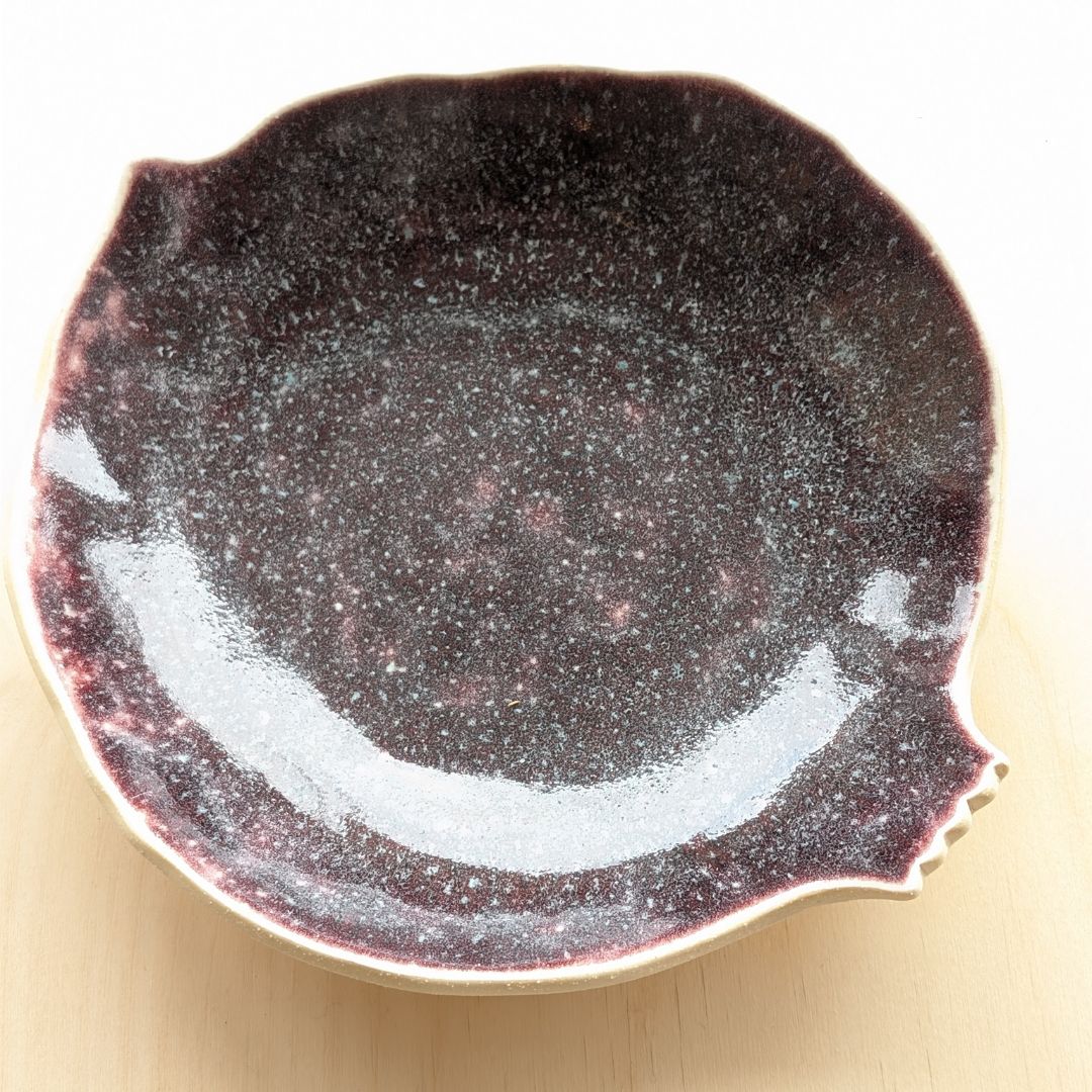Son émail artisanal, d’un grenat profond moucheté, rappelle les textures naturelles. Chaque assiette est unique, comme un fragment de voyage capturé dans la matière.