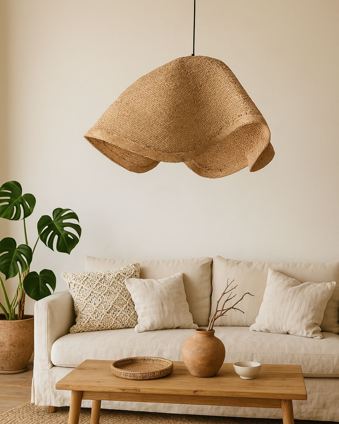 Son tressage naturel, à la fois simple et sophistiqué, diffuse une chaleur subtile et crée un jeu d’ombres apaisant, idéal pour réchauffer n’importe quelle pièce de la maison. Que ce soit dans un salon, une chambre ou une salle à manger, cette suspension apporte caractère, texture et une véritable connexion à la terre.